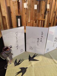 本日、森町仲町のpieces(旧アマノレコード店)で開催中の 「新春駄洒落展」 小学生のけい君作の駄洒落の数々。。。